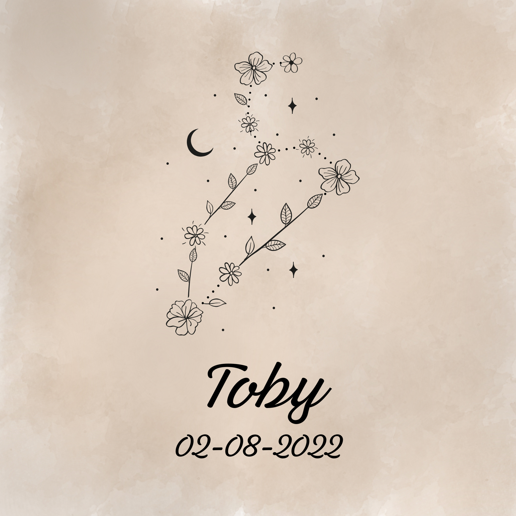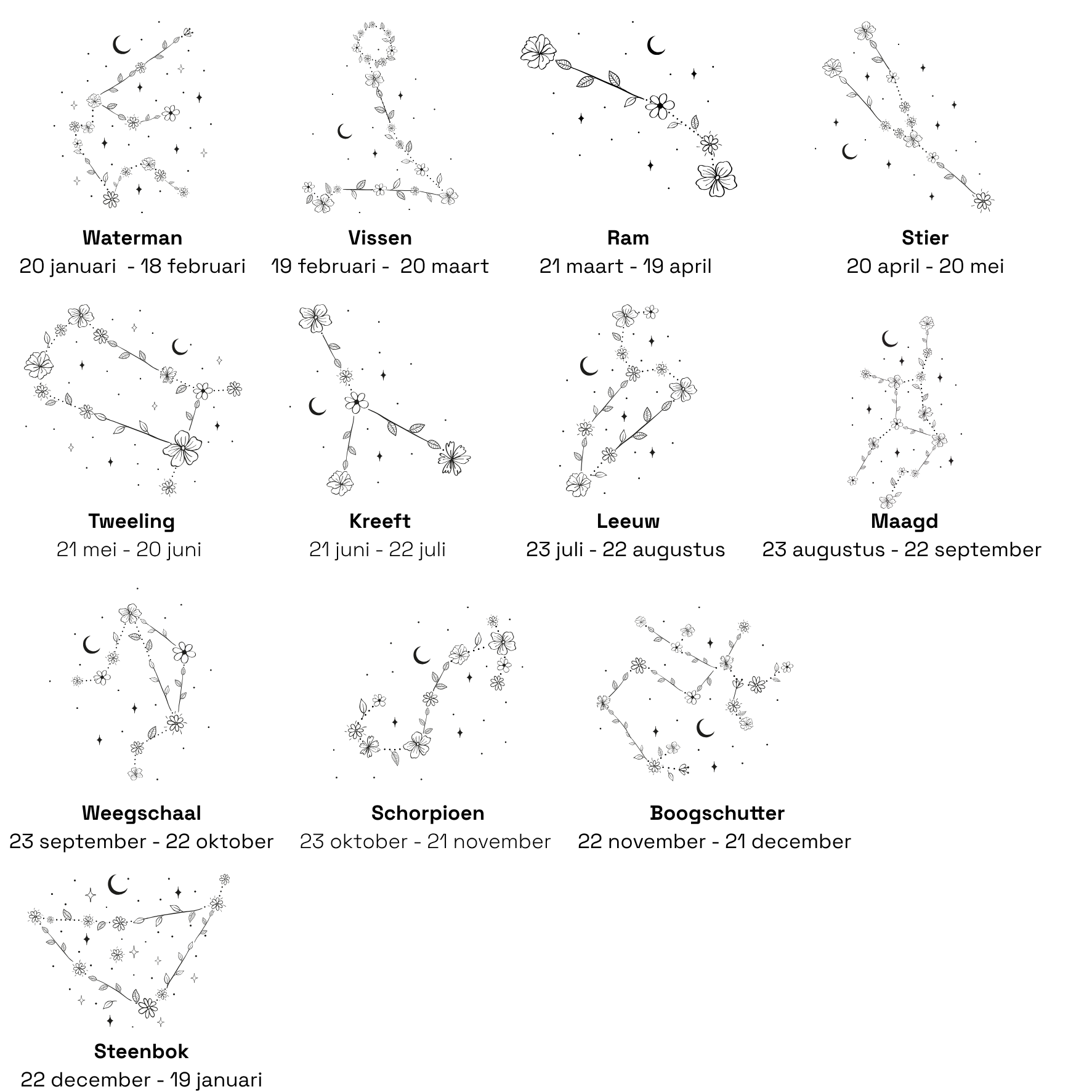 Een uniek geboortetegeltje met het sterrenbeeld van de maand waarin jouw kindje geboren is, subtiel afgebeeld met bloemen, sterren en de maan. Een magisch aandenken aan een nieuw begin en volledig te personaliseren.